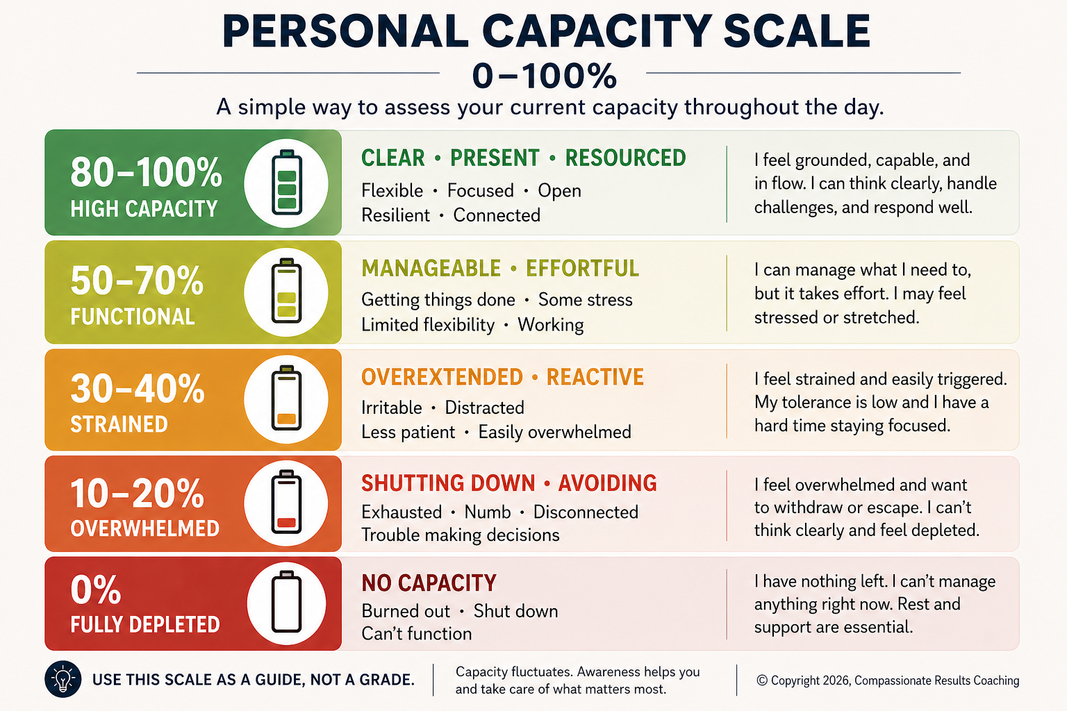 Personal capacity is the mental, emotional, and physical energy we have available to meet life as it happens. It determines how we think, how we feel, how we respond, and what we are able to access within ourselves.